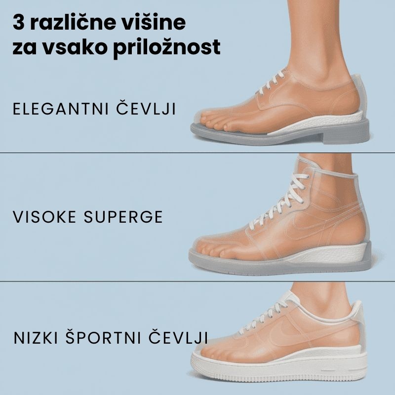 Napredna ortopedska zasnova zagotavlja, da se neopazno prilegajo kateremukoli čevlju in vsaki priložnosti, hkrati pa povečajo višino in razbremenijo vaše sklepe.